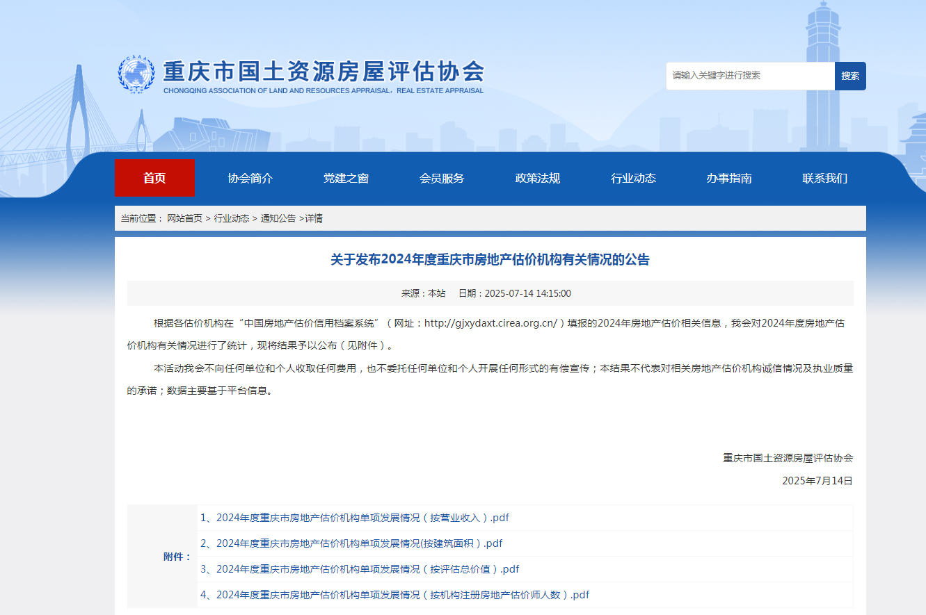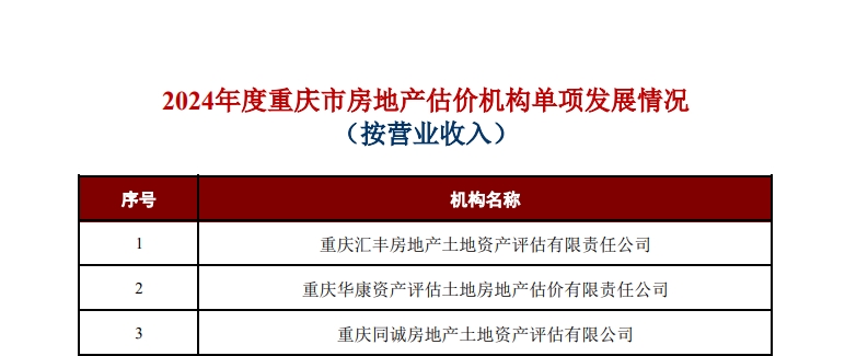 重庆市国土资源房屋评估协会于2025年7月14日发布《2024年度重庆市房地产估价机构发展情况公告》。数据显示,重庆汇丰房地产土地资产评估有限责任公司在2024年度重庆市房地产估价机构单项发展情况(按营业收入)中排名位列第1名。